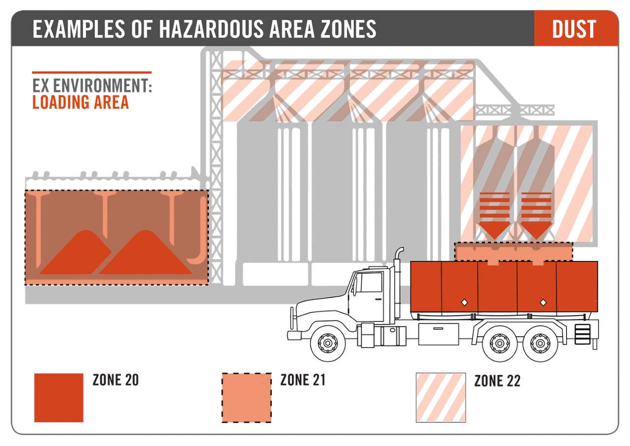 - Zone 20/(C1D0/C1Z0) – Explosive mixtures are present in the air continuously. Category 1 equipment required.